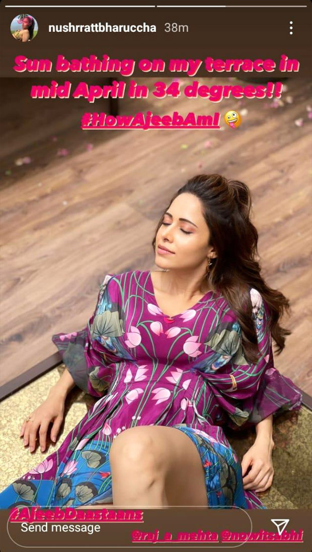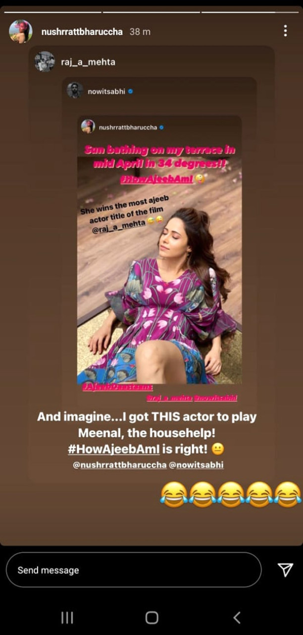 She uploaded a sun-kissed picture, on which she wrote, "Sun bathing on my terrace in Mid-April in 34 degrees #HowAjeebAmI!" Her co-star, Abhishek Banerjee reposted her picture, on which he wrote, "She wins the most Ajeeb actor title of the film" Adding to him, even director Raj Mehta put up the story, mocking Nushrratt. He wrote, "And imaging.. I got THIS actor to play Meenal, the Househelp! #HowAjeebAmI is right!